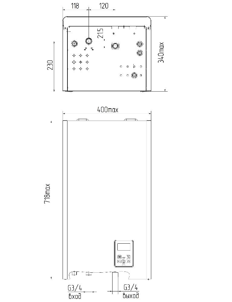 Управление электрическим котлом РЭКО 12-ПМ осуществляется при помощи функциональной панели с ЖК-дисплеем, имеющей все необходимые индикации (информация о текущих температурах, режимах работы и неисправностях).