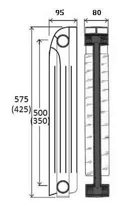 Каждая из секций радиатора имеет закладной элемент и наружное обребрение. В глубине секции расположены пять вертикальных ребер, а вверху находится конвекционное окошко, не допускающее перегрева прибора и улучшающее теплосъем.