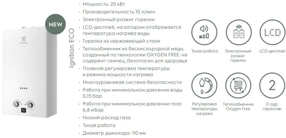 Electrolux GWH 10 Ignition ECO – это автоматическая газовая колонка производительностью 10 л/мин. При включении воды происходит автоматический розжиг горелки из нержавейки. Колонка Ignition ECO может работать даже при минимальном давлении воды - 0,15 бар, что часто является актуальным во многих квартирах.