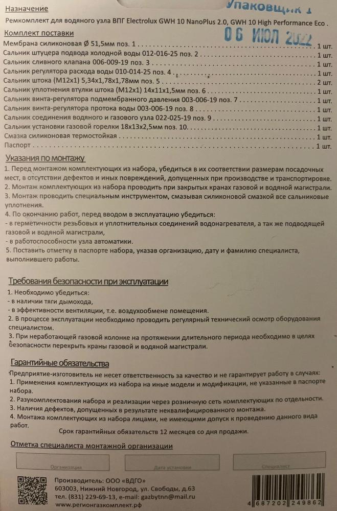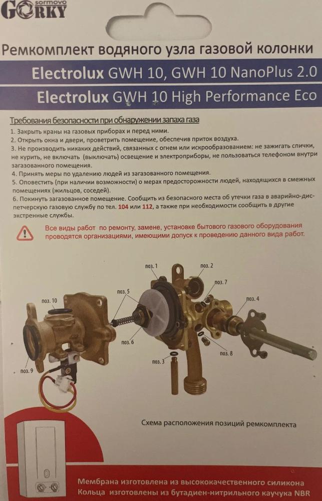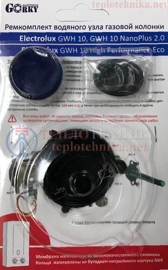 Ремкомплект для водяного узла проточного газового водонагревателя Electrolux GWH 10 nanoplus 2.0 и Electrolux GWH 10 High Performance Eco.