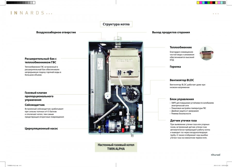 Kiturami Twin Alpha-13 - газовый настенный котел для отопления и c возможностью мгновенной подачи горячей воды. Котлы Kiturami Twin Alpha совмещают в себе преимущества котлов типа накопительных, а также технологии типов котлов с возможностью мгновенного нагрева. Этим достигается высокий КПД. Установлен новый тип сдвоенного теплообменника из чистой меди для более лучшей теплопроводности в высокотемпературных частях и алюминиевого, который используется в низкотемпературных частях с целью предотвращения коррозии и продления срока службы. Котлы Kiturami Twin Alpha очень экономичны. Во время режима ожидания потребление энергии менее 1 Вт.