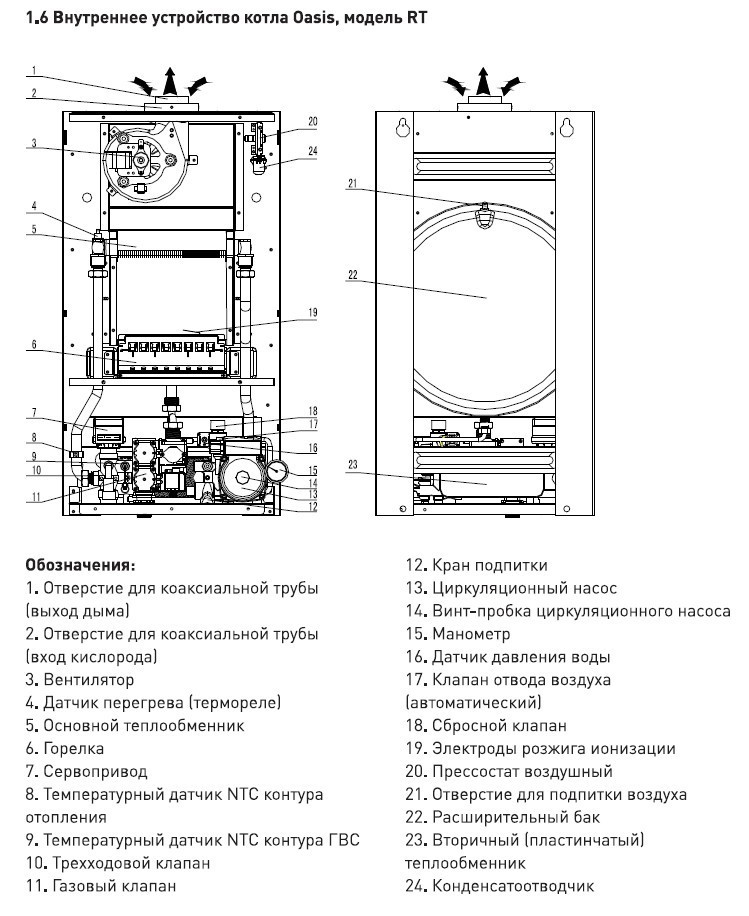 Газовый двухконтурный котел Oasis RT-18 предназначен для горячего водоснабжения и отопления помещений площадью до 180 кв/м .Он имеет систему принудительного дымоудаления, не сжигает кислород, поэтому может быть установлен в жилом помещении. Котел настроен на подключение к системе центральной подачи природного газа, но при необходимости может использовать баллонный сжиженный газа. Для такого подключения необходимо поменять форсунки и изменить сервисные настройки на пульте. Срок службы настенного котла «Oasis» – 12 лет со дня пуска в эксплуатацию