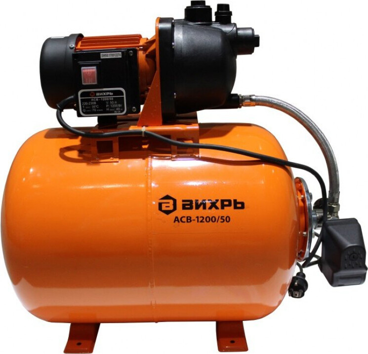 ВИХРЬ АСВ-1200/50 обладает мощностью 1200 Вт, максимальная глубина всасывания 9 метров, максимальная подача воды 70 литров в минуту, максимальный напор 40 метров. Емкость гидроаккумулятора составляет 50 литров.