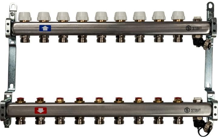 Коллектор Stout на 9 выходов без расходомеров, с клапаном выпуска воздуха и сливом. Производится в Италии под тщательным контролем, проходя многочисленные тесты и сертификацию оборудования. Благодаря этому распределительный коллектор STOUT обладает рядом преимуществ, среди которых надежность конструкции, качественные материалы, оптимальная комплектация блока, варианты исполнения для теплого пола и для радиаторной разводки.